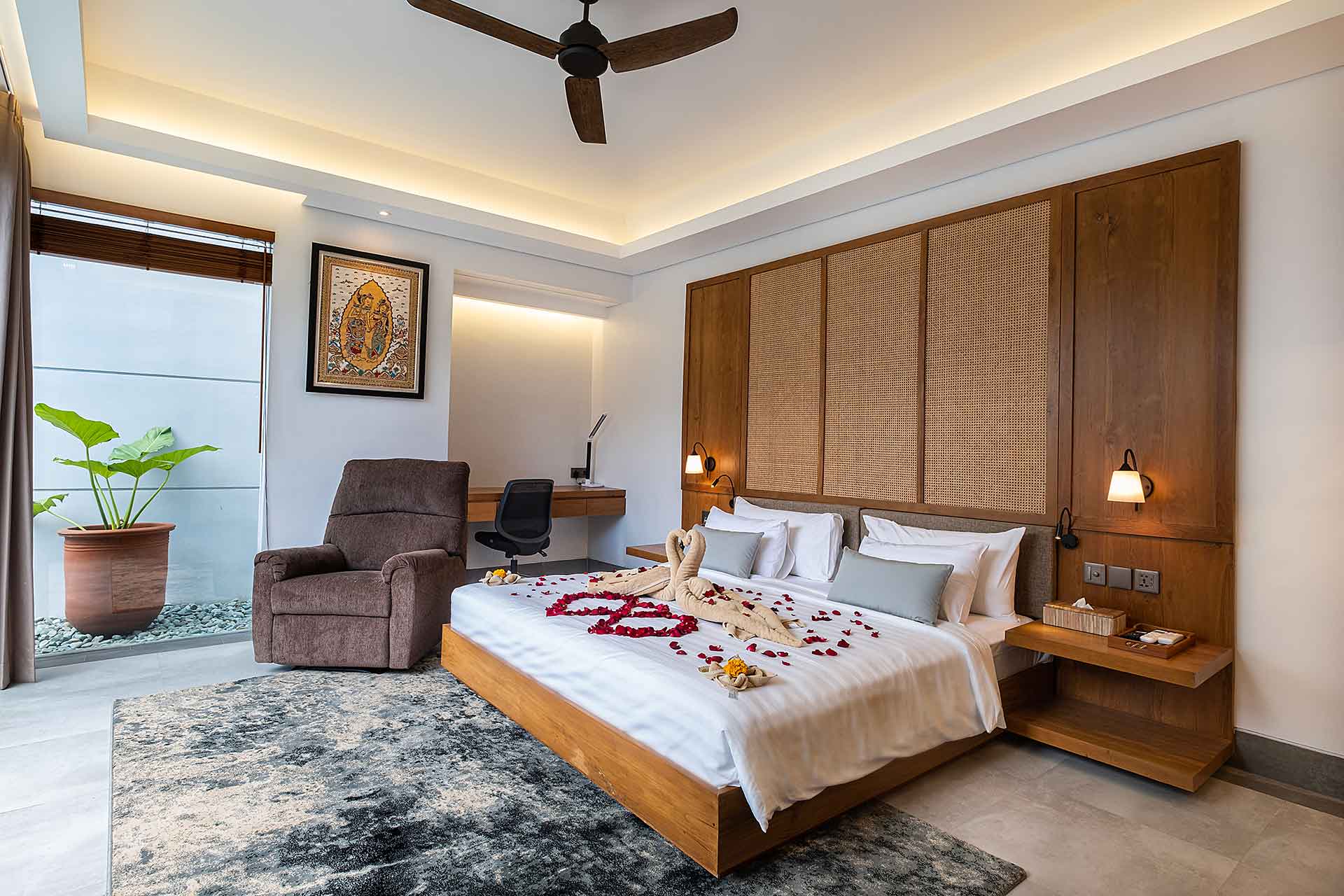 Furnished with a high-quality king-size bed and premium amenities, the bedroom offers a serene and comfortable setting designed to embrace natural light and gentle tropical breezes.